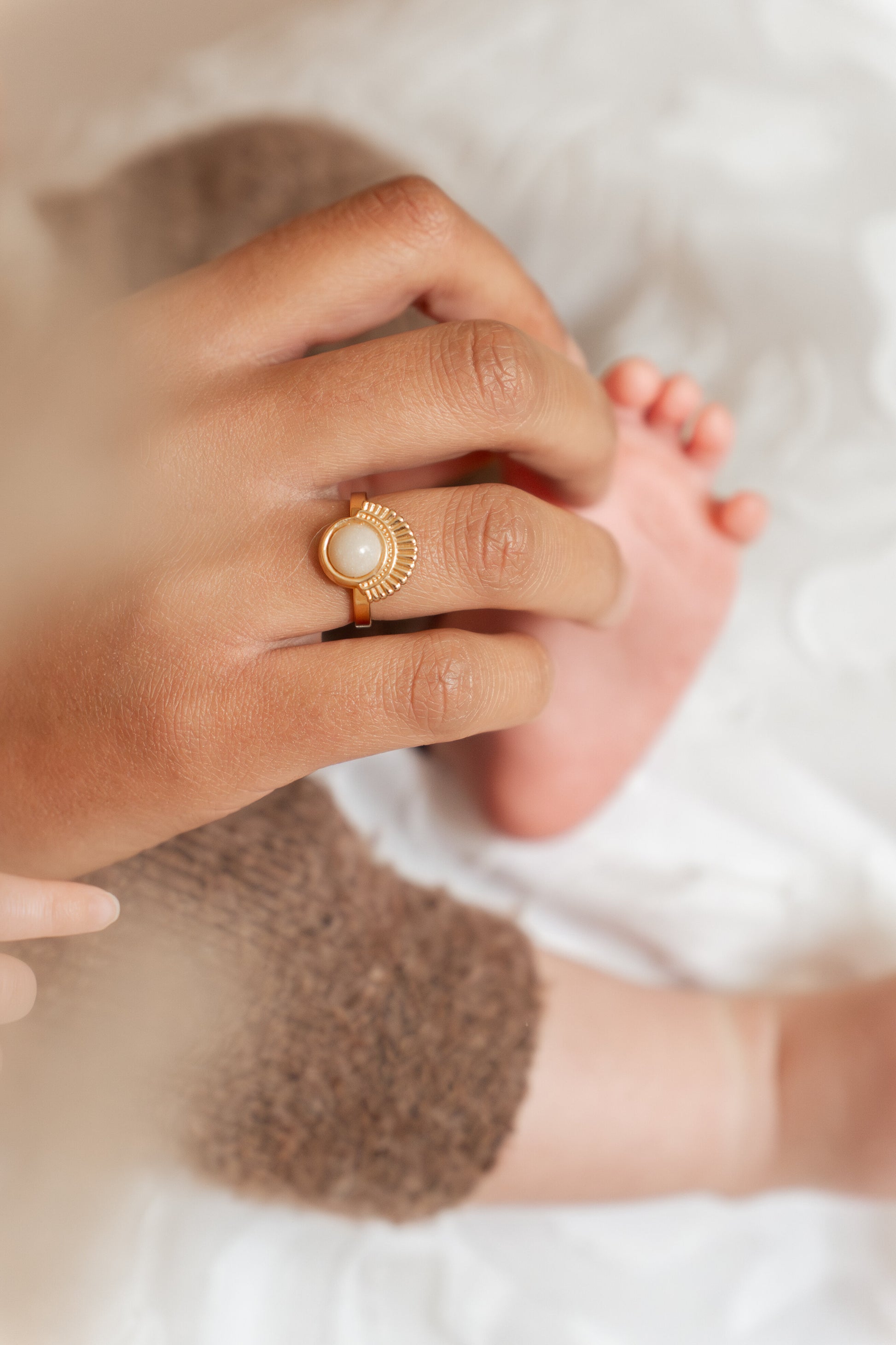 Son cabochon rond en lait maternel, serti au-dessus d’un demi-soleil doré, symbolise ce moment délicat où la nuit laisse place à la lumière , comme la rencontre entre une mère et son enfant.