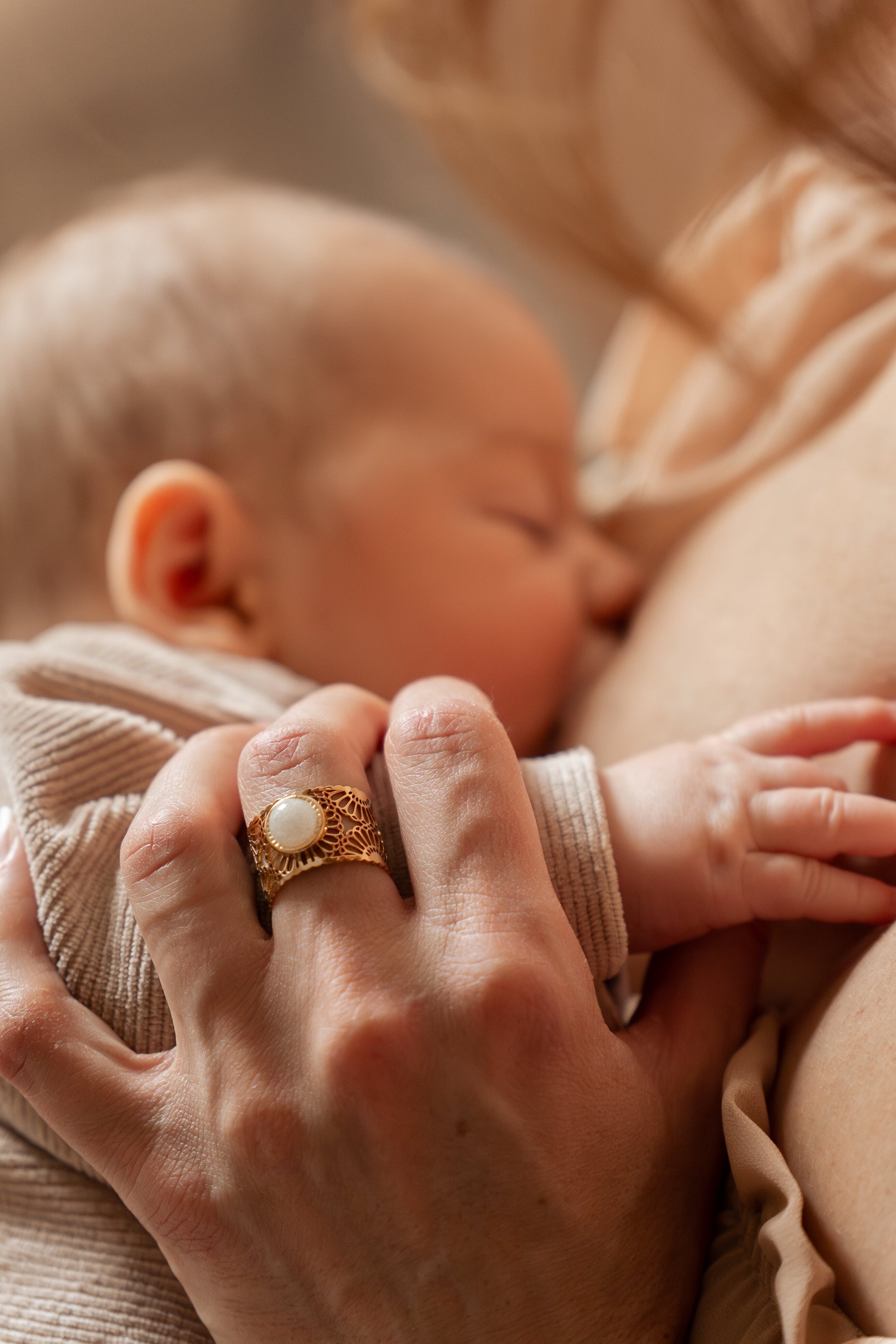 Son anneau ajouré, finement travaillé comme une dentelle de lumière, entoure un cabochon rond en lait maternel : un symbole de pureté, de douceur et de maternité.