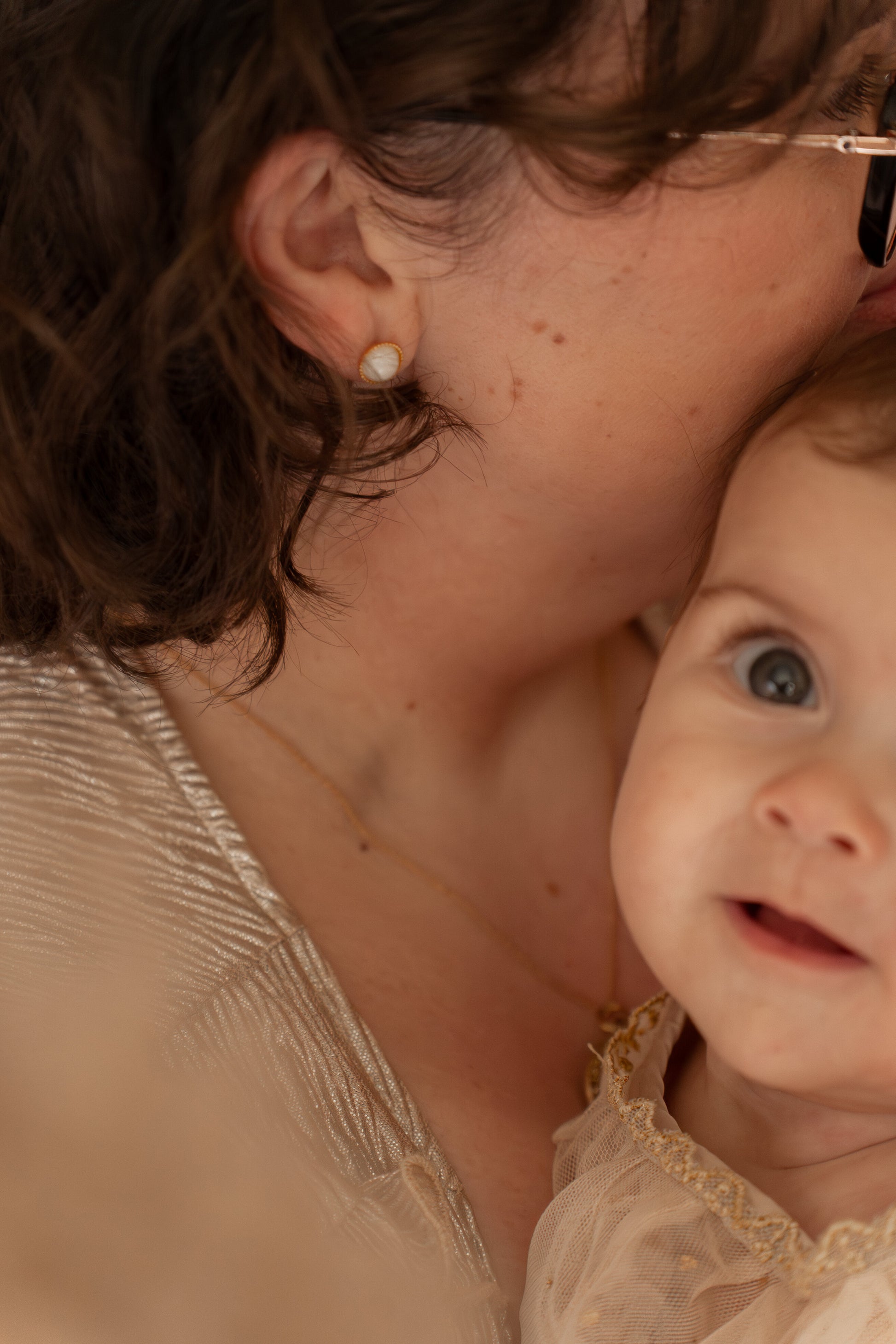 D’une douceur lumineuse, elles se composent de deux cabochons ronds en lait maternel, sertis dans un fin anneau doré.