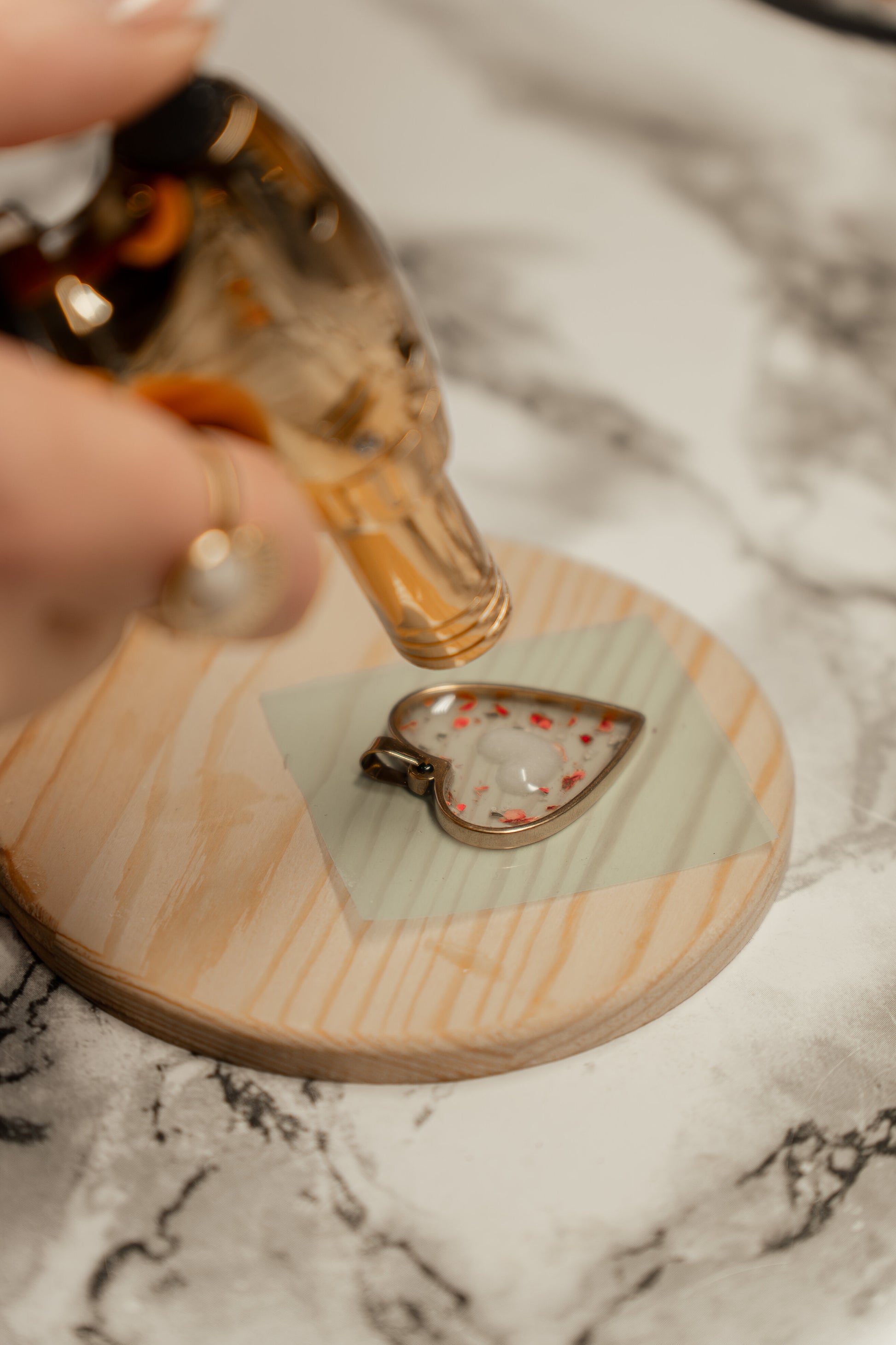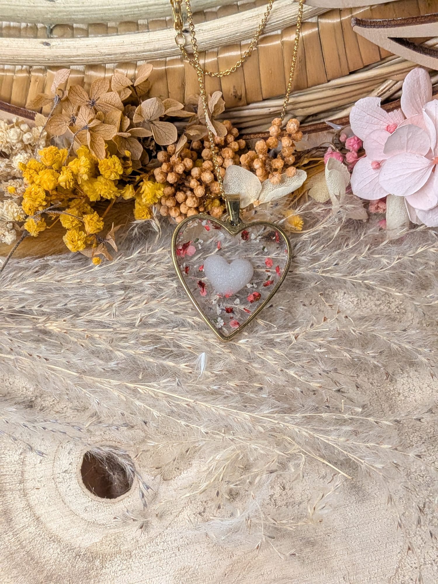 Les inclusions florales viennent ponctuer le bijou comme des fragments d’émotion, rappelant que l’amour se compose de détails, de souvenirs et de moments précieux.