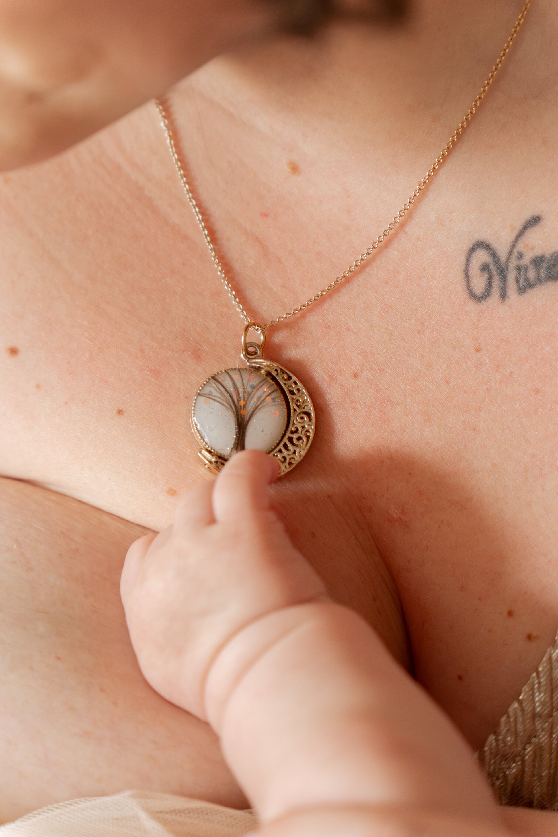 • un côté “arbre de vie”, inscrit dans du lait maternel et délicatement parsemé d’éclats.