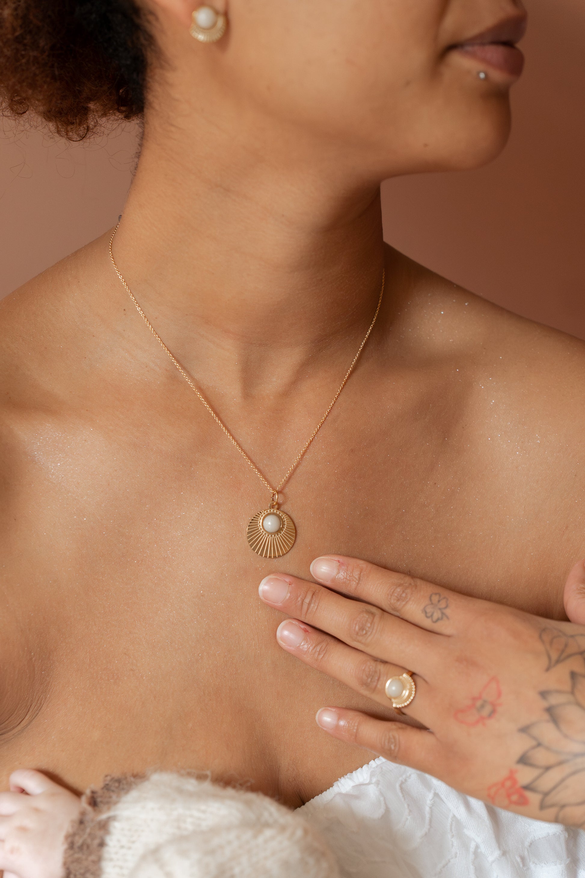 Son disque doré rayonnant encadre un cabochon rond en lait maternel, symbole de l’origine, de la douceur et du lien qui unit mère et enfant.